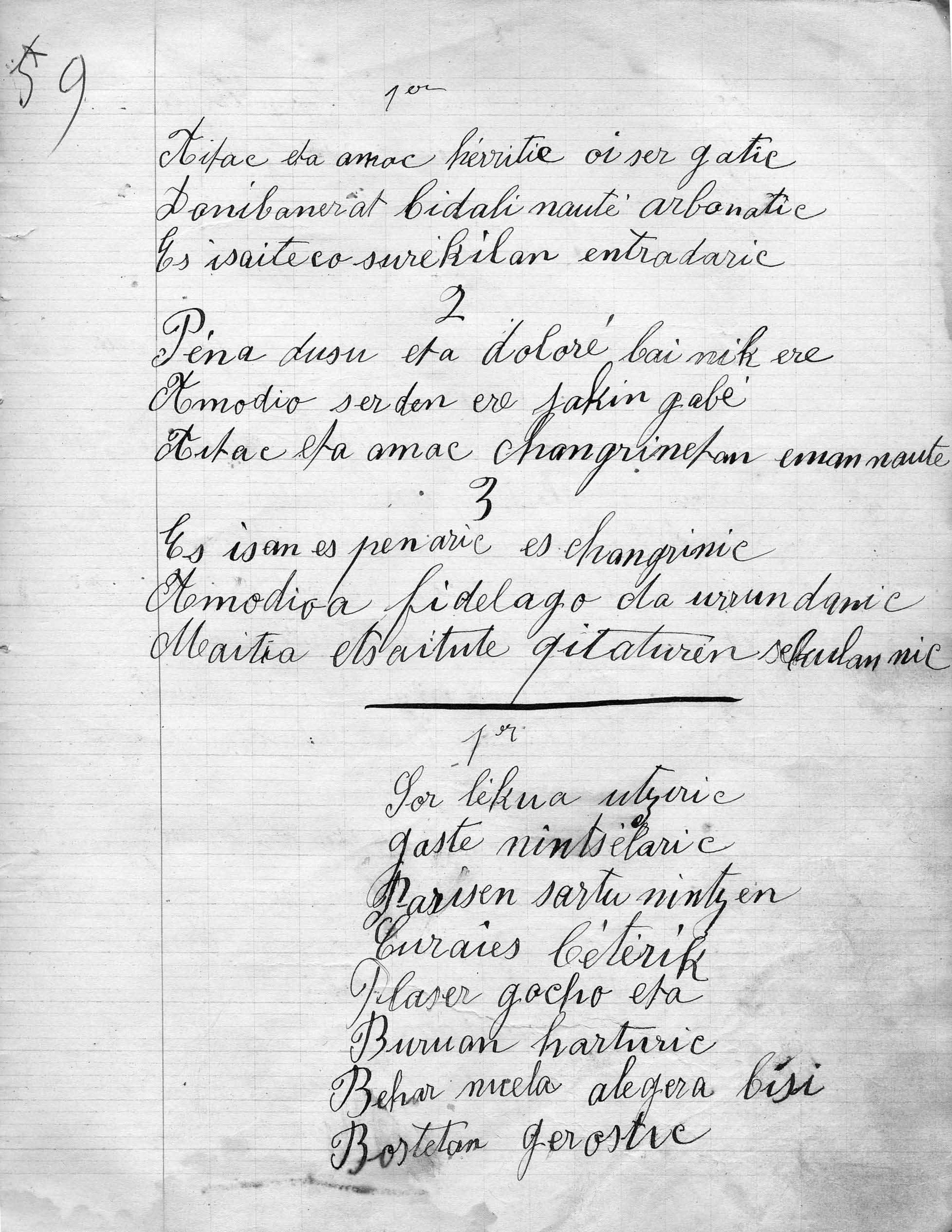 "Jai-bazkalondo batez, Errekaldeko sukaldean bertsotan ari omen zan Jose Bernardo, emezortzi urte besterik etzituen Plazida bere alabarekin.