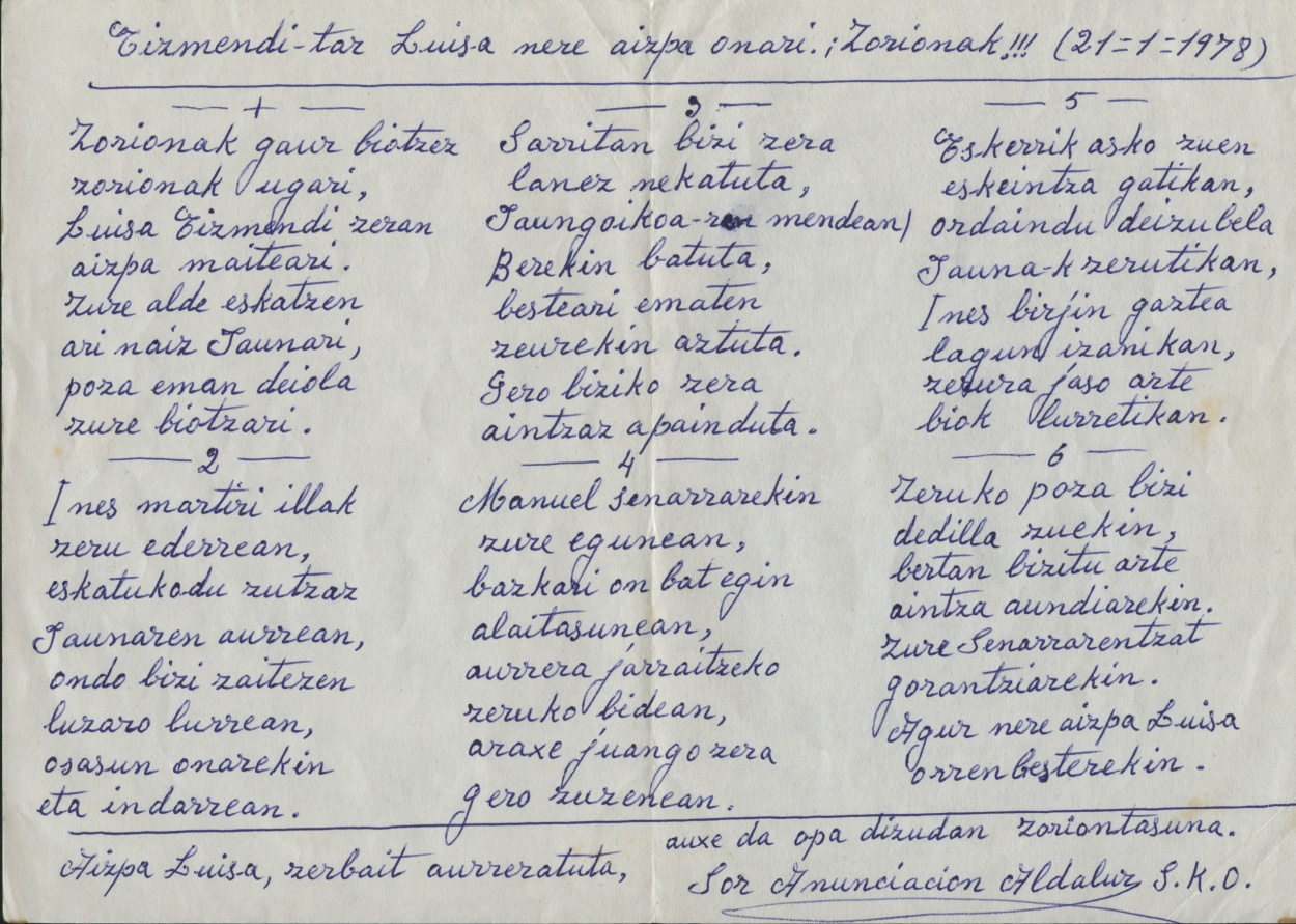 Eizmendi'tar Luisa nere ahizpa onari. Zorionak!!! [Bertsoa] / Justina Aldalur