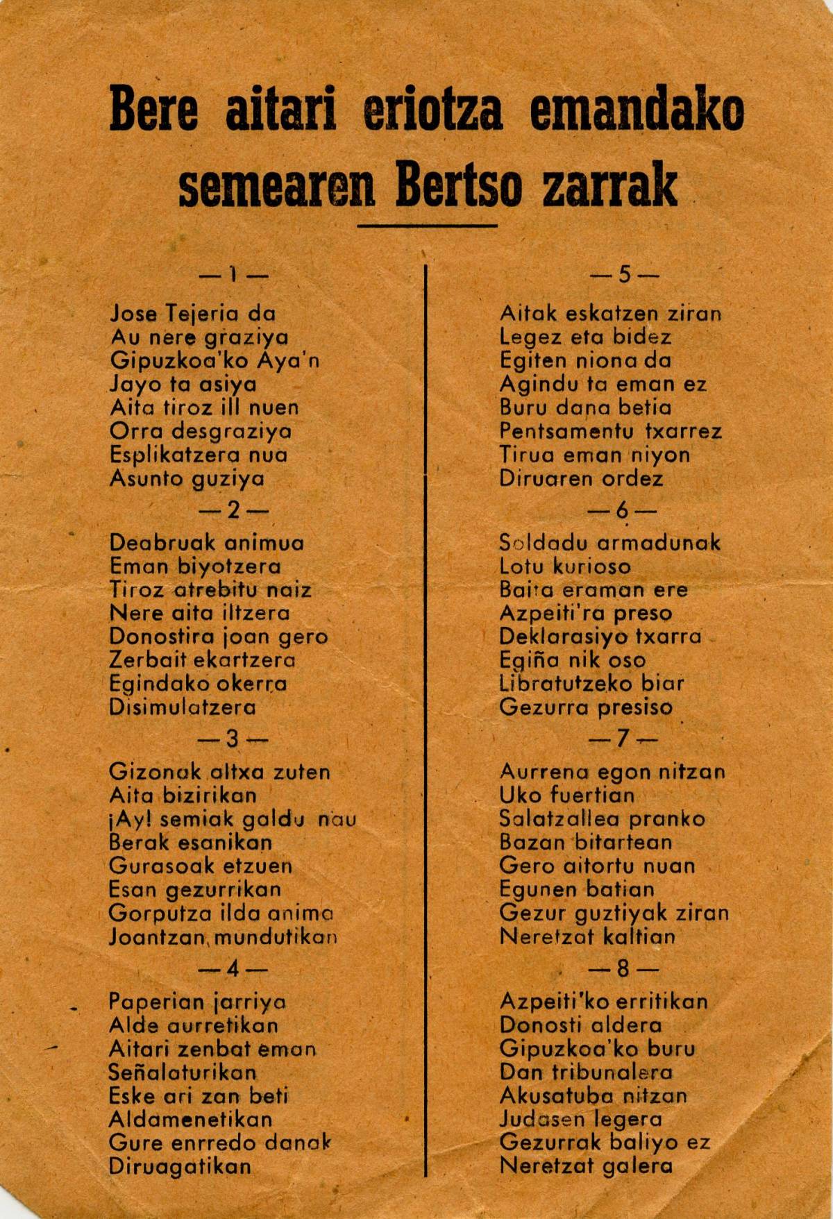 Bere aitari heriotza emandako semearen bertso zaharrak [Bertsoa] / Juan Mari Zubizarreta "Etxeberritxo"