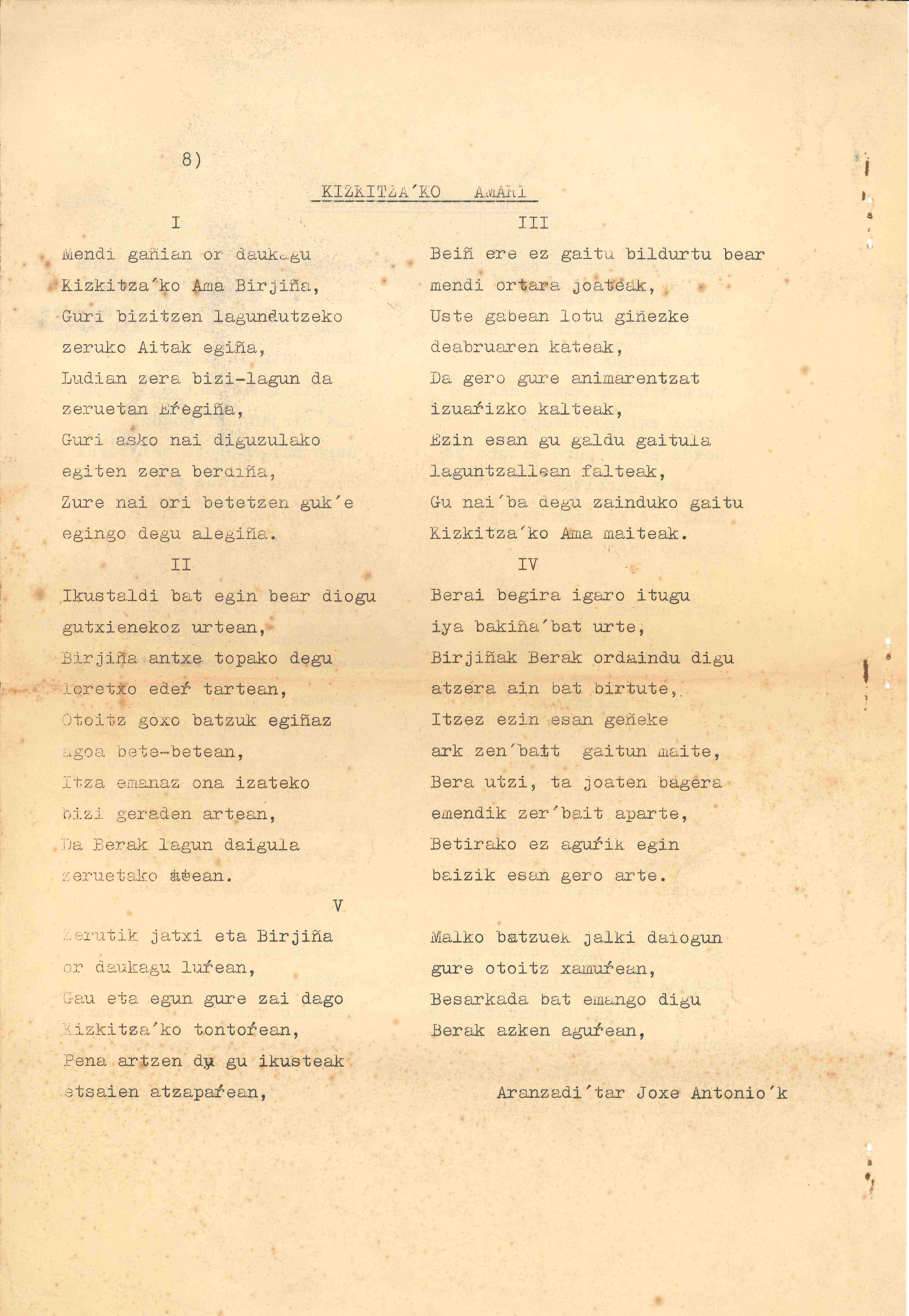 Kizkitza'ko amari [Bertsoa] / Joxe Antonio Aranzadi