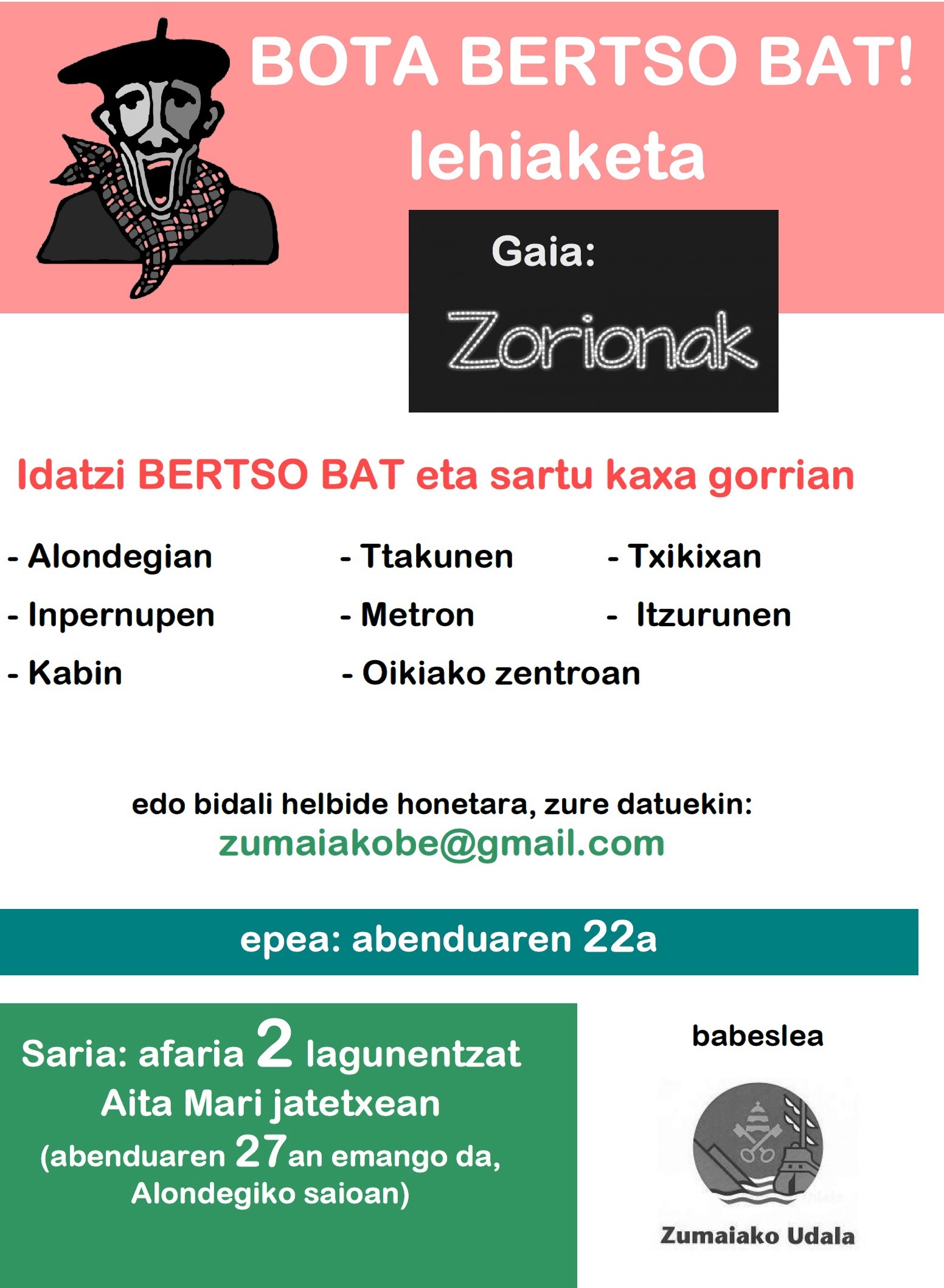 Bota bertsoa abenduaren 22a baino lehen! Aukera badago posta elektronikoz bidaltzeko ere, helbide honetara: zumaiakobe@gmail.com