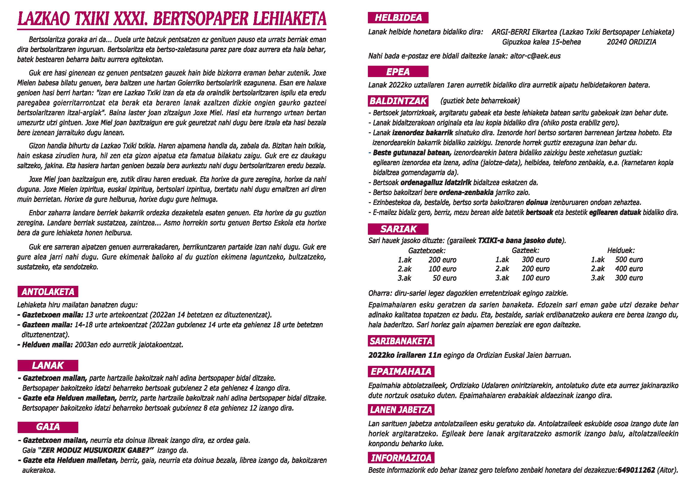 - LAZKAO TXIKI XXXI. BERTSOPAPER LEHIAKETA