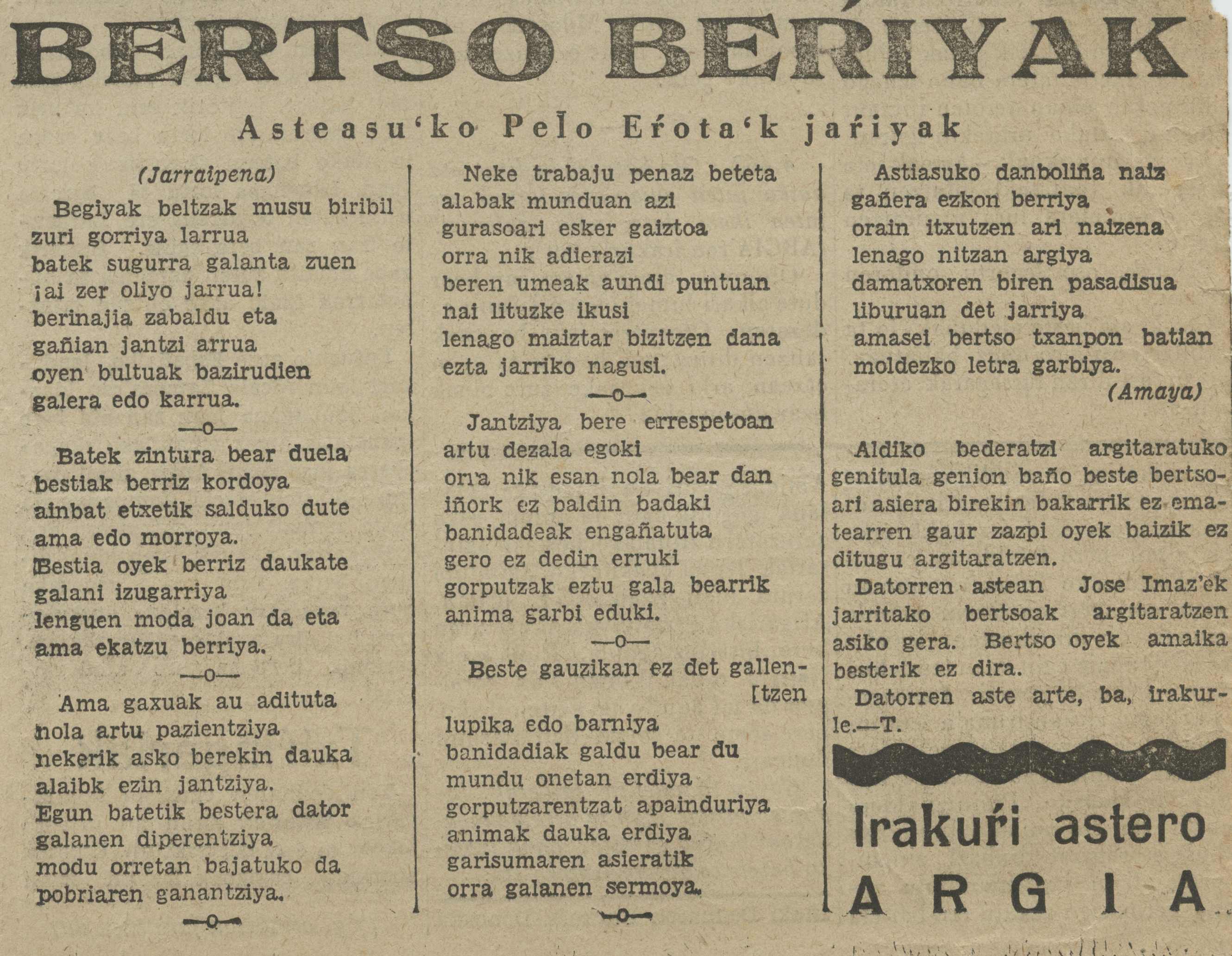 Bertso berriak [Begiak beltzak, musu biribil, zuri gorria larrua] [Bertsoa] / Pello Errota