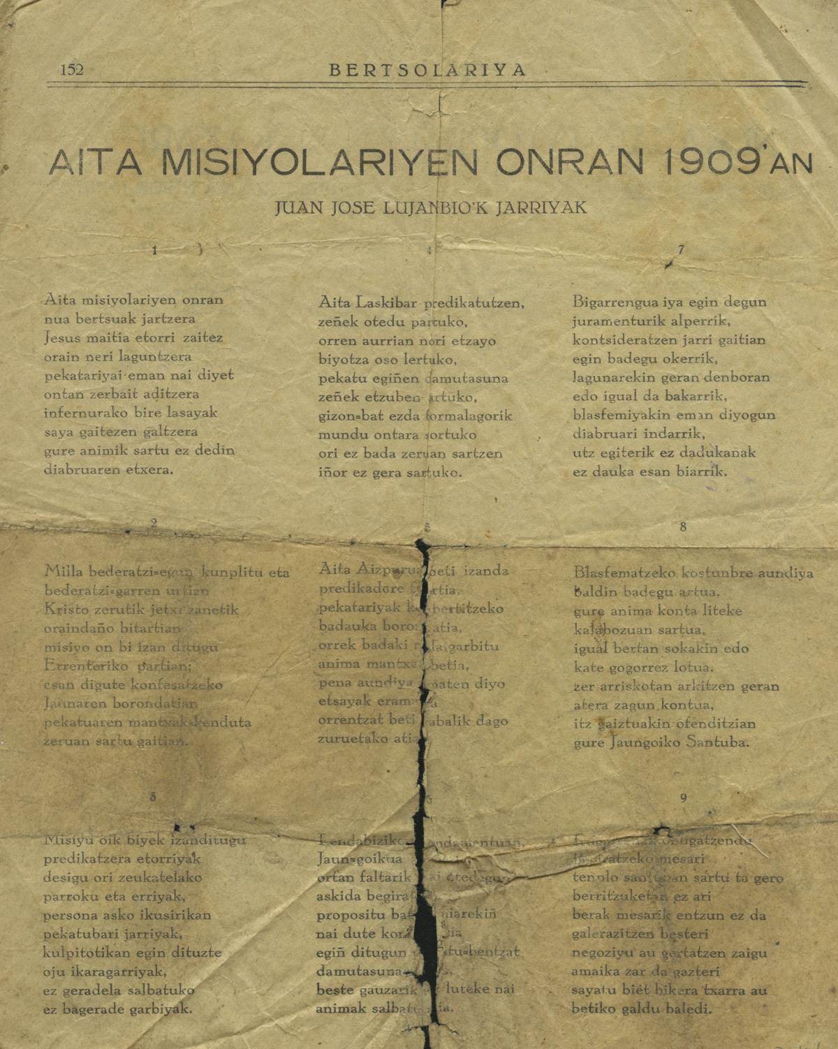 Aita misiyolariyen onran 1909'an Juan Jose Lujanbio'k jarriyak [Bertsoa] / Manuel Lujanbio "Txirrita"