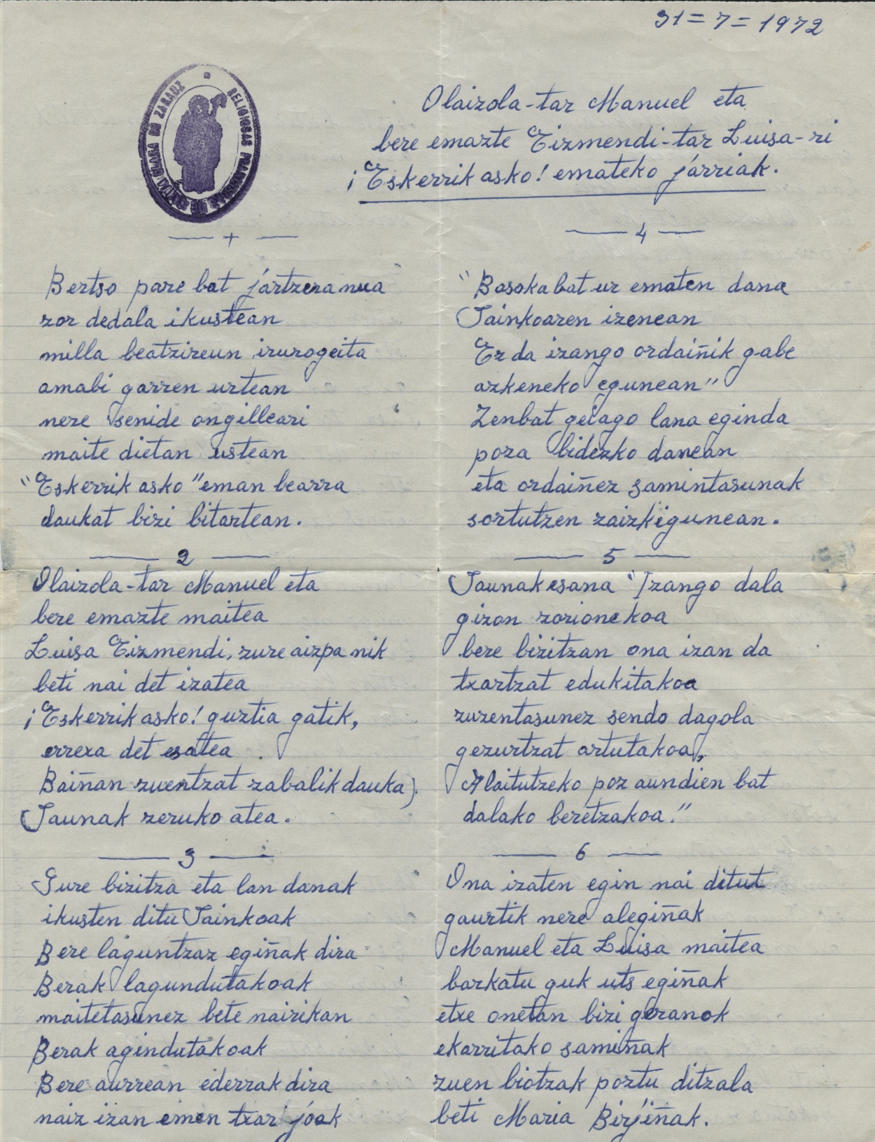 Olaizola'tar Manuel eta bere emazte Eizmendi'tar Luisari eskerrik asko emateko jarriak [Bertsoa] / Justina Aldalur