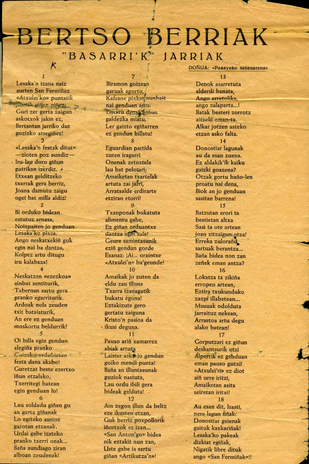 Bertso berriak Basarrk jarriak [Lesakan izana naiz aurten San Ferminez] [Bertsoa] / Iñaki Eizmendi "Basarri"