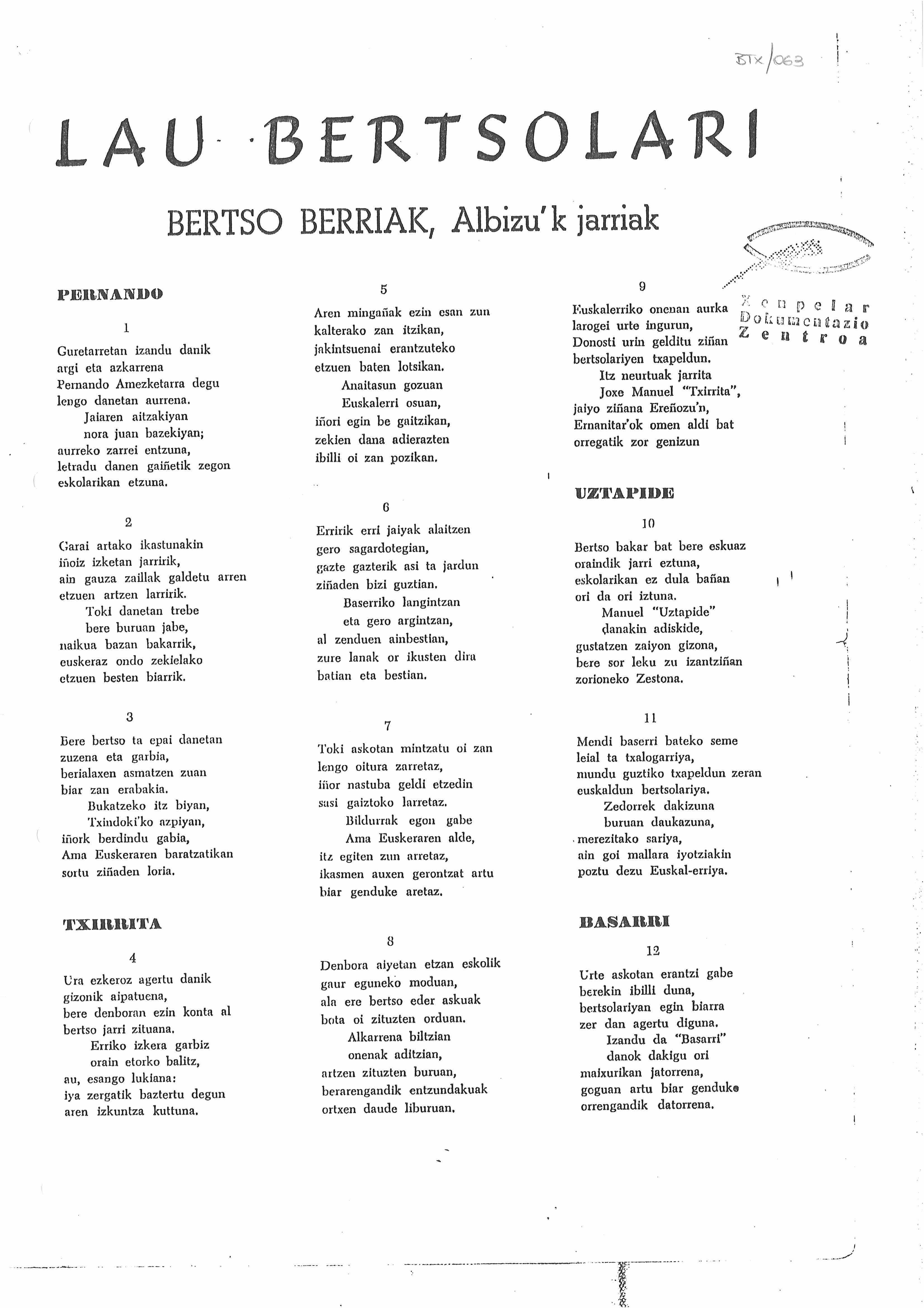 Lau Bertsolari [Bertsoa] / Gillermo Albizu