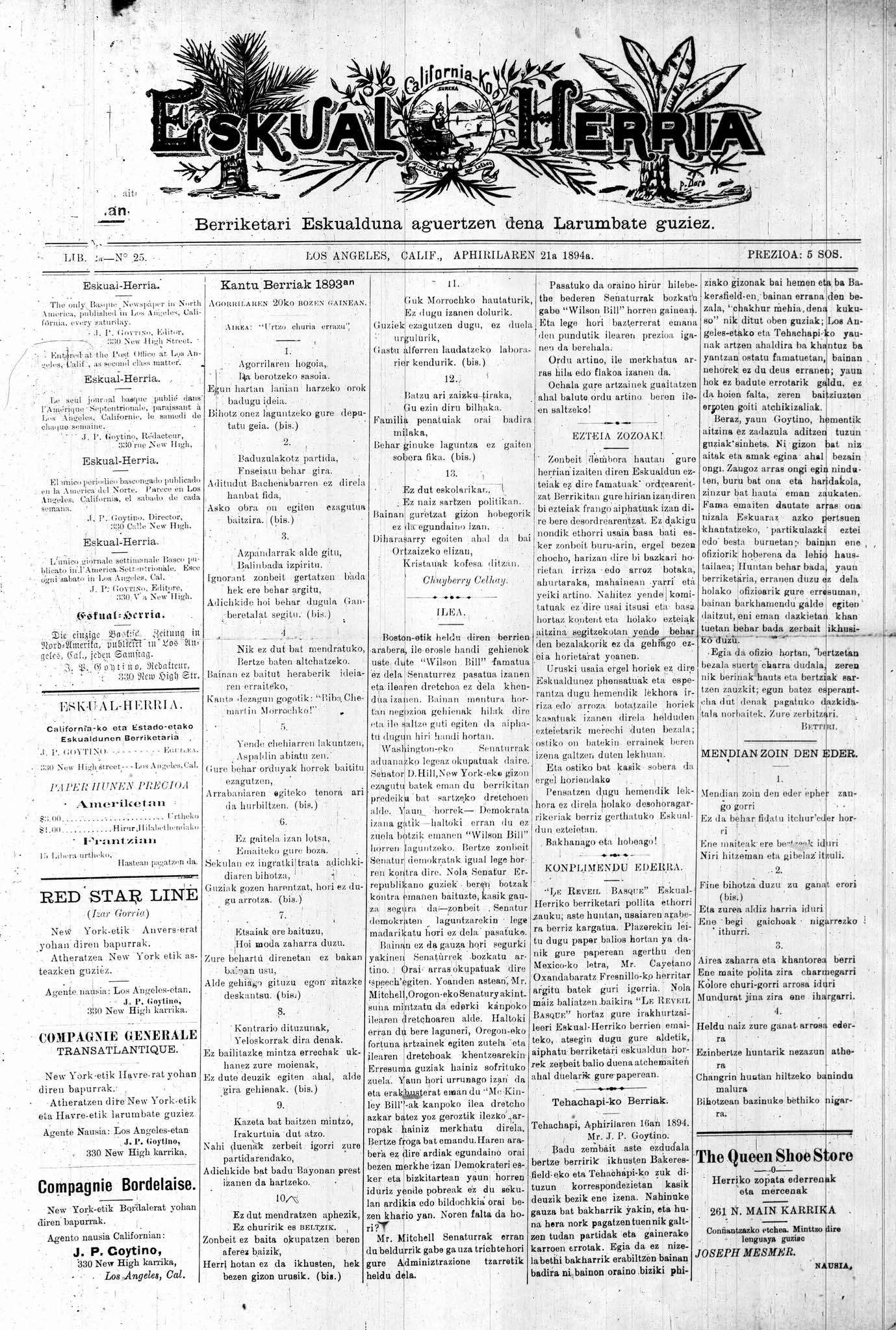 Kantu berriak 1893an agorrilaren 20ko bozen gainean [Bertsoa] / Chuyberry Celhay