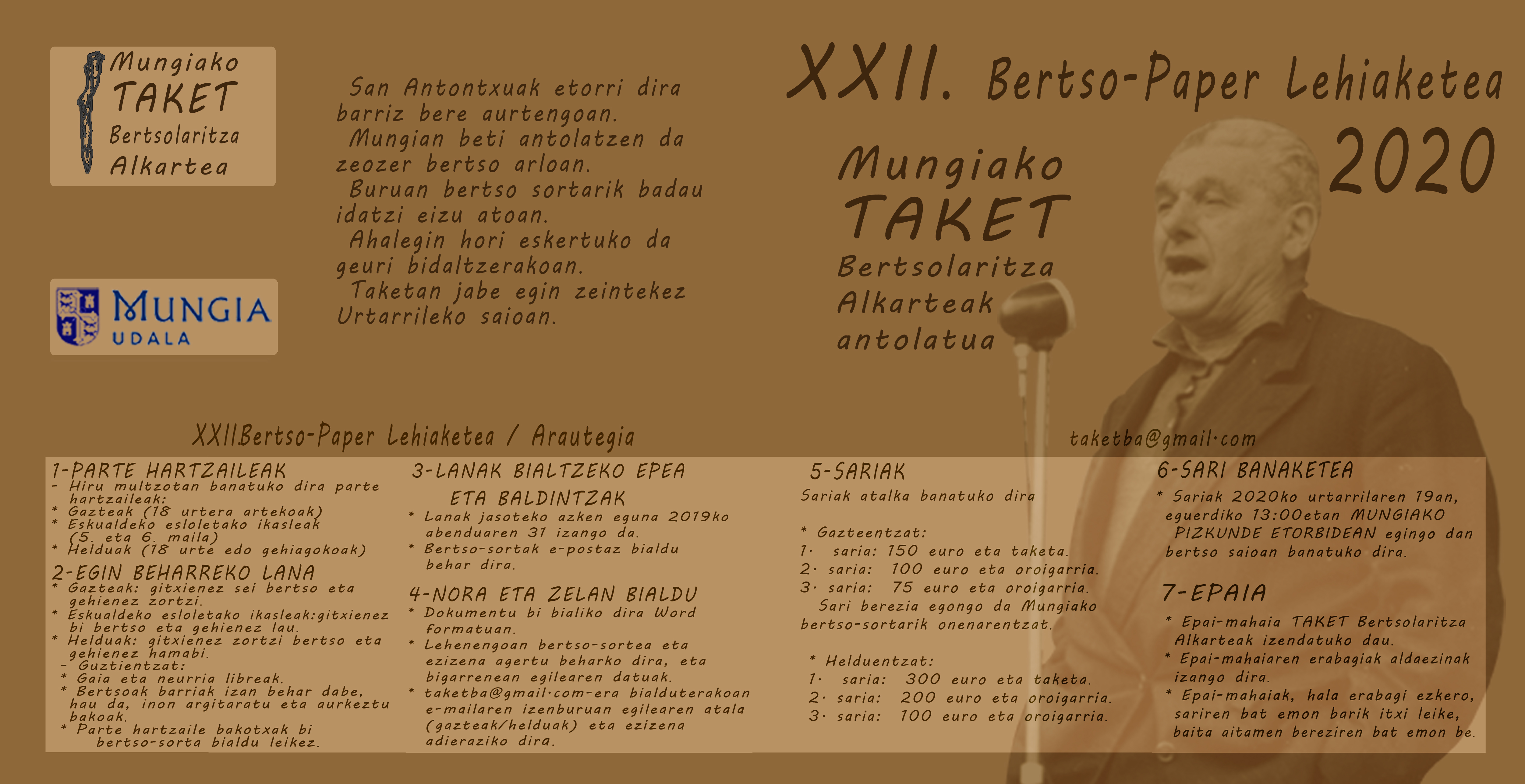 Sariak 2020ko urtarrilaren 19an, eguerdiko 13:00etan Mungiako Pizkunde Etorbidean egingo den bertso saioan banatuko dira.