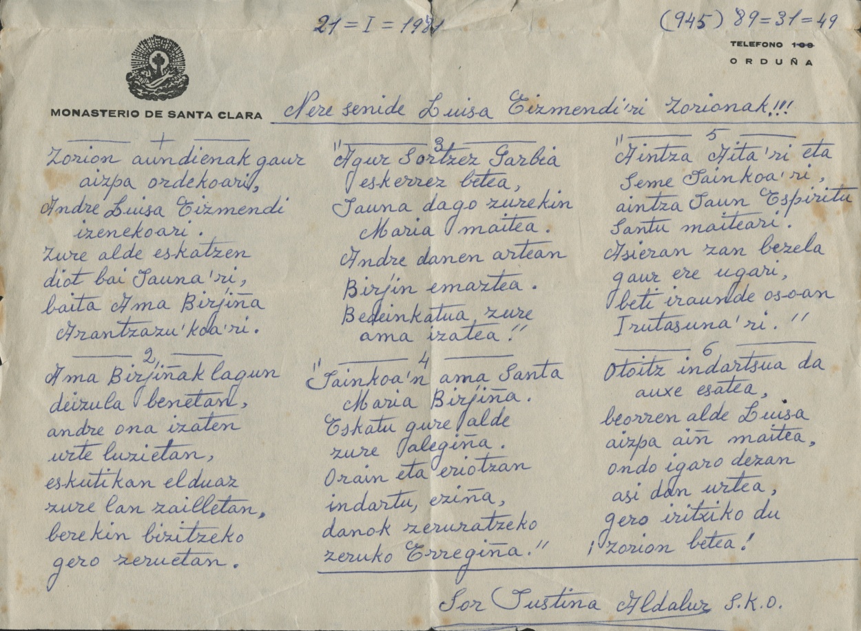 Nere senide Luisa Eizmedi'ri Zorionak!!! [Bertsoa] / Justina Aldalur