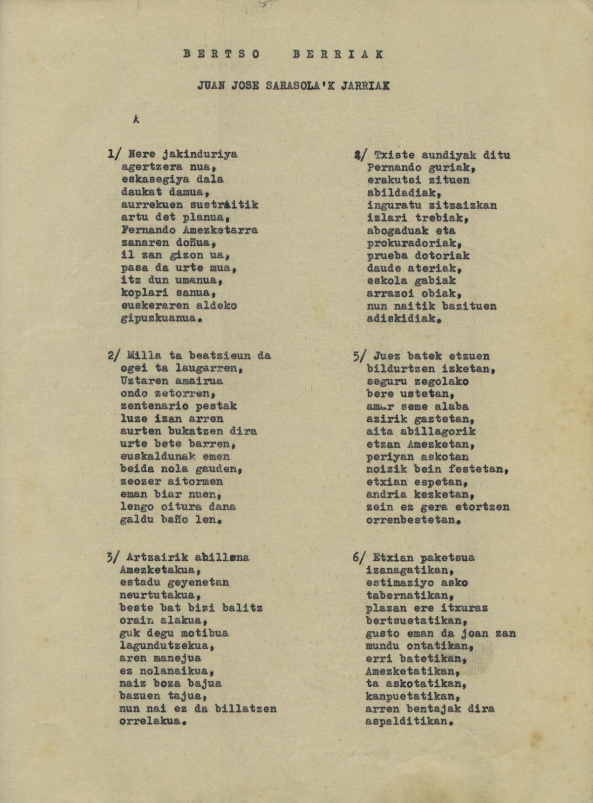 Bertso berriak [Nere jakinduria agertzera nua] [Bertsoa] / Juan Jose Sarasola "Lexo"