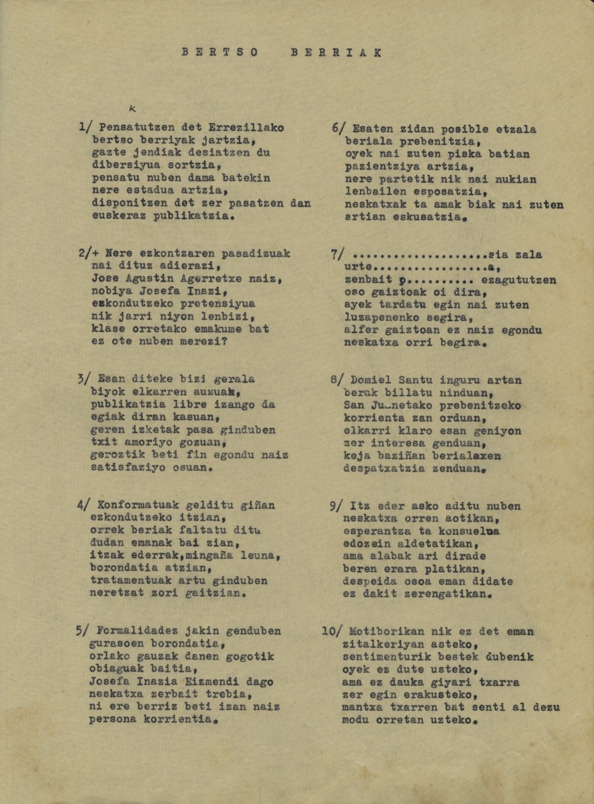 Bertso berriak [Pentsatutzen det Errezilako bertso berriak jartzia] [Bertsoa] / Jose Agustin Agerretxe