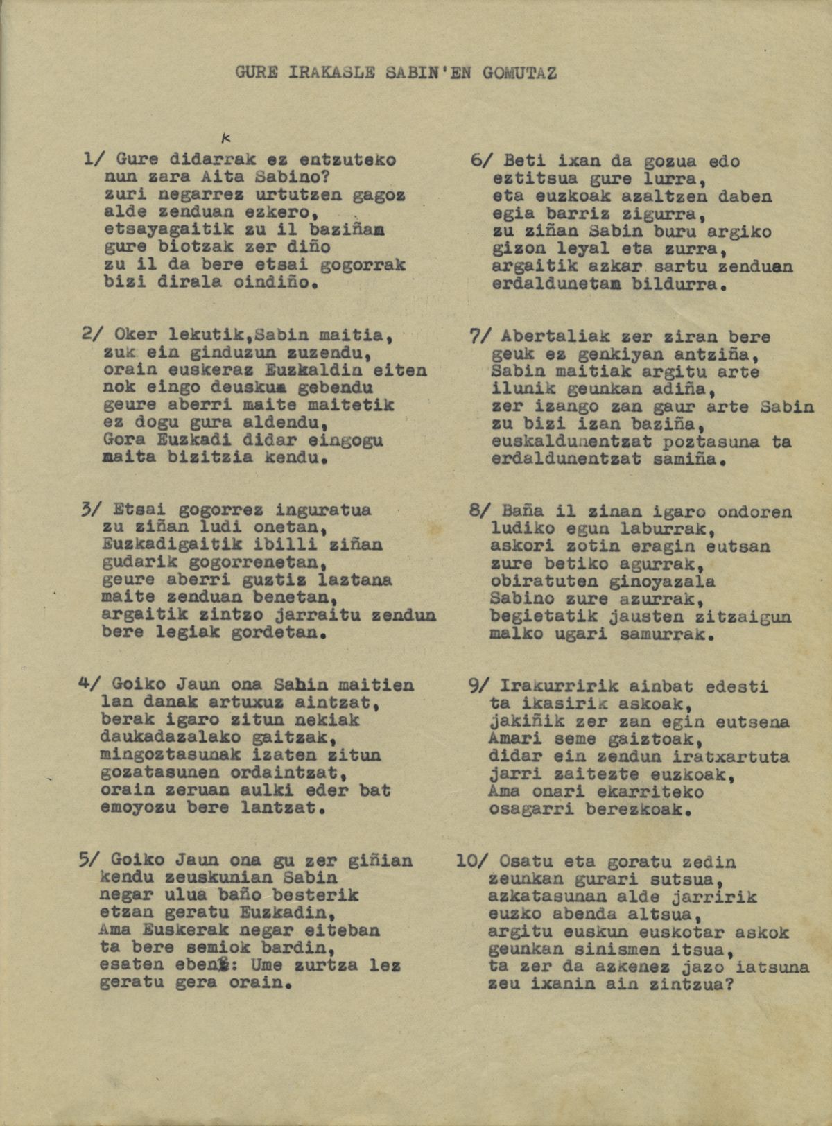 Gure irakasle Sabinen gomutaz [Bertsoa]