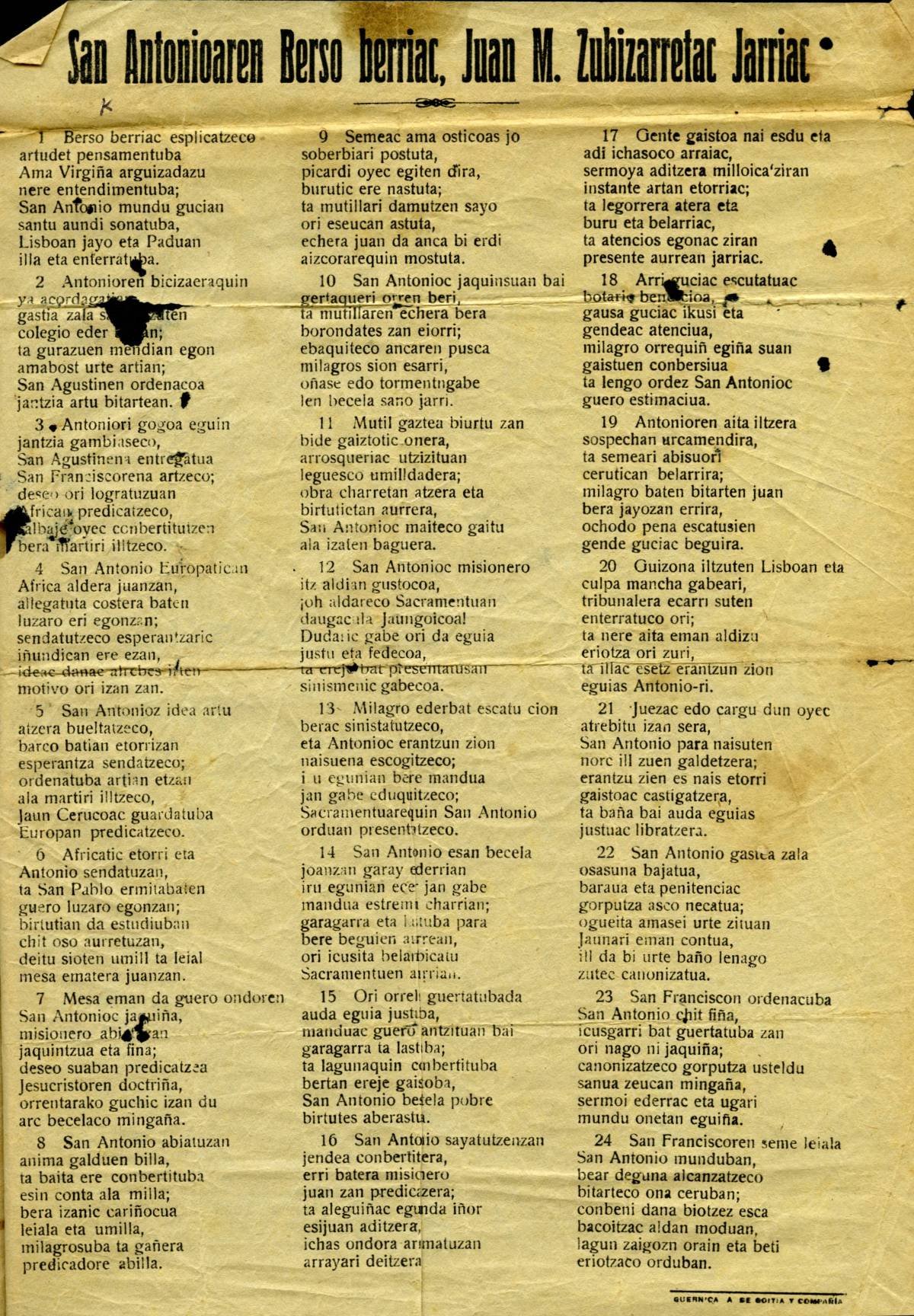 San Antonioren bertso berriak, Juan M. Zubizarretak jarriak [Bertsoa] / Juan Mari Zubizarreta "Etxeberritxo"