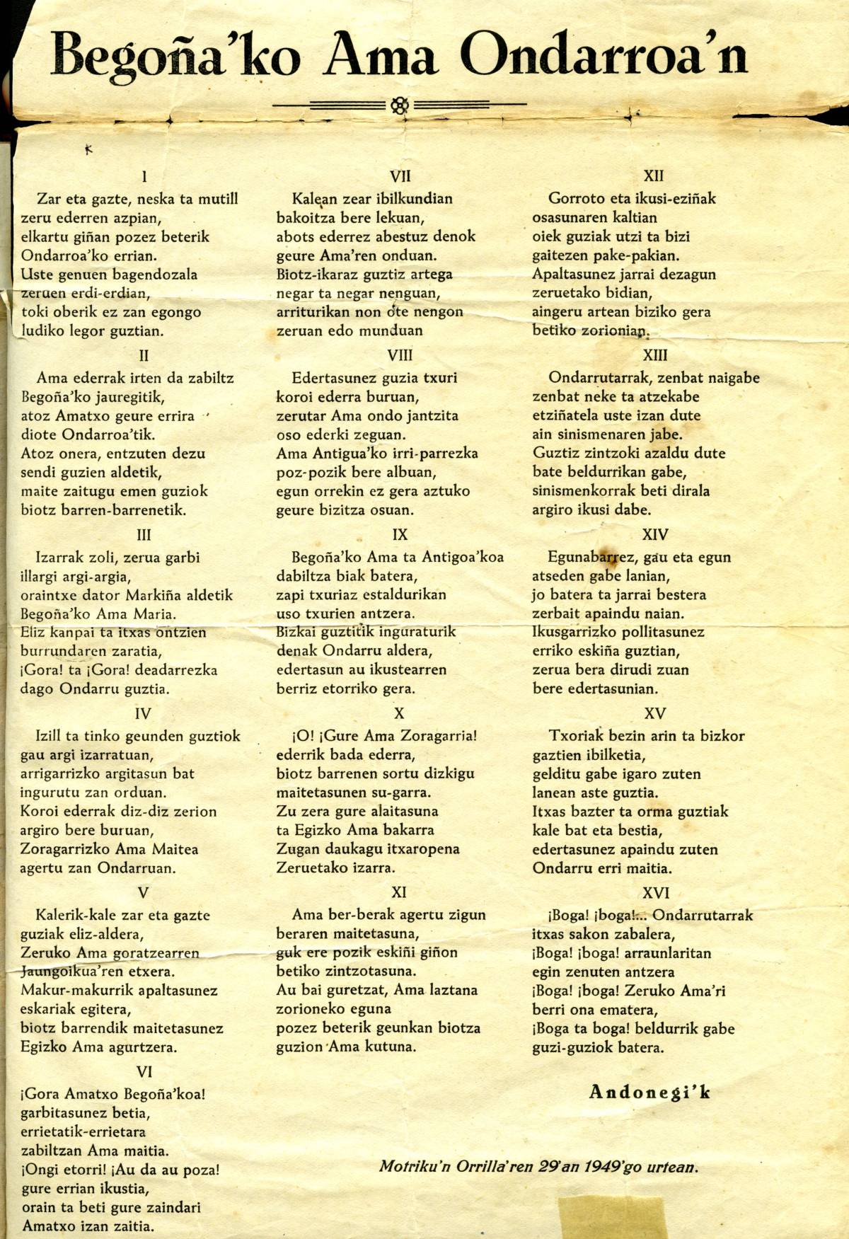 Begoñako Ama Ondarroan [Bertsoa] / Ziriako Andonegi