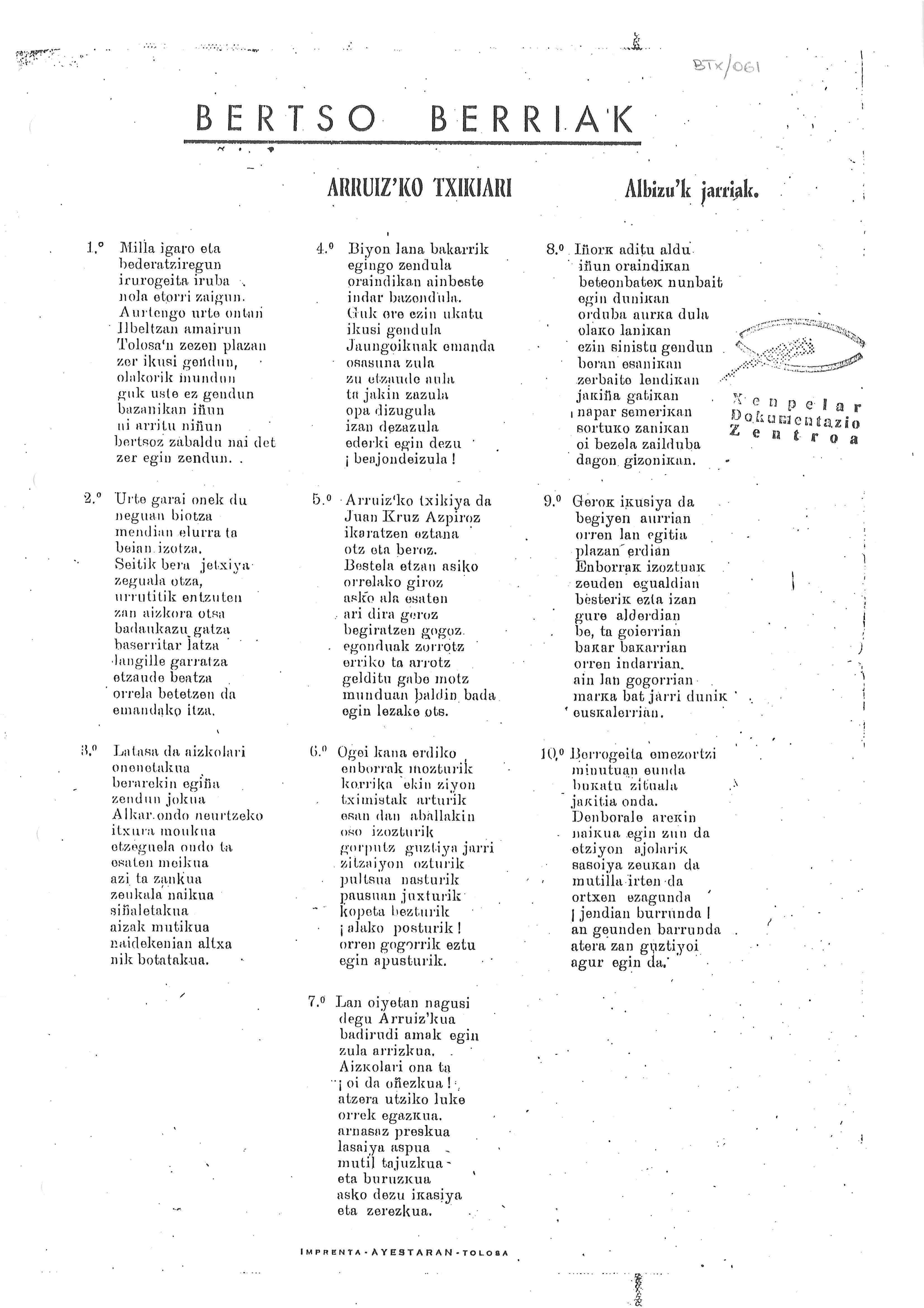 Bertso berriak Arruizko Txikiari [Bertsoa] / Gillermo Albizu