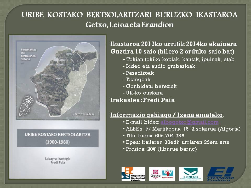 - UK-ko Bertsolaritzari buruzko ikastaroa antolatu dau ALBEk Getxo, Leioa eta Erandioko Udalekaz batera. Ikastaroaren oinarri, "Uribe Kostako Bertsolaritza (1900-1980)" liburua eta gidaria, Fredi Paia bera, liburuaren egilea.